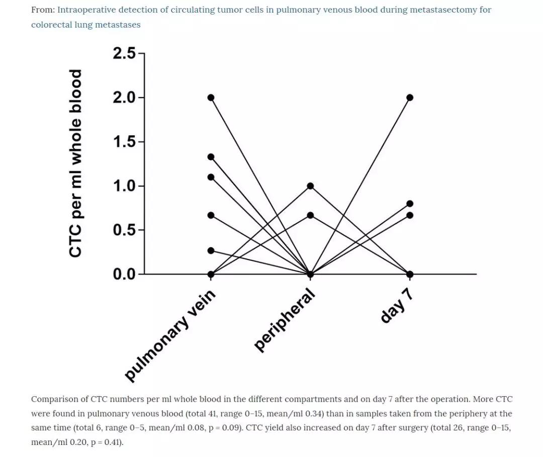 按照前面介绍的血流图,结直肠癌细胞进入血流,应该在门静脉中容易找到,或者转移到肺脏后,应该在病侧肺静脉内,容易找到CTC。真得会这样吗?